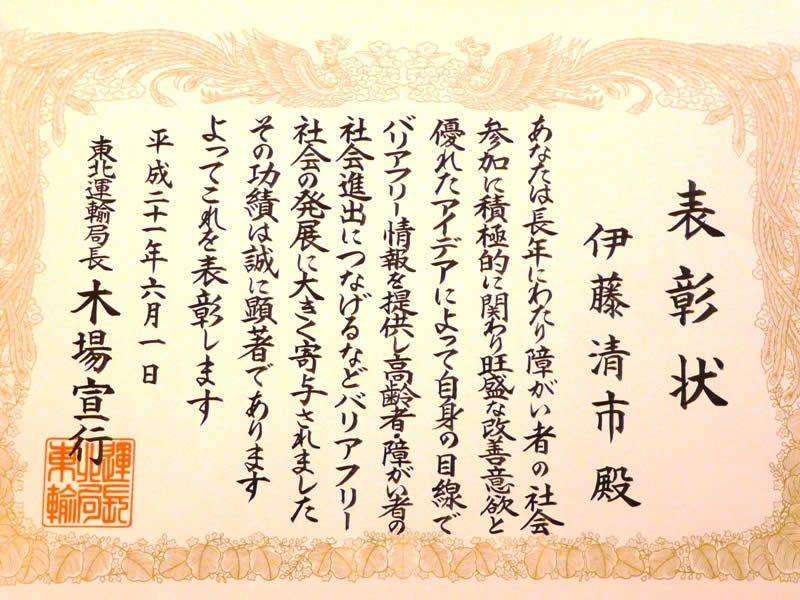 自動車及び観光に関する各事業の振興発展に寄与し、公共の福祉の増進に貢献された方を表彰するもの(東北運輸局プレリリースより)ということで、「日本観光旅館連盟 西東北支部」様をはじめとする団体功労、観光、タクシー、トラック、貨物利用運送、販売、整備の各事業者、そして私が受賞した特別功労(バリアフリー化の普及促進)と、東北各県から今年は46名の方が受賞されました。