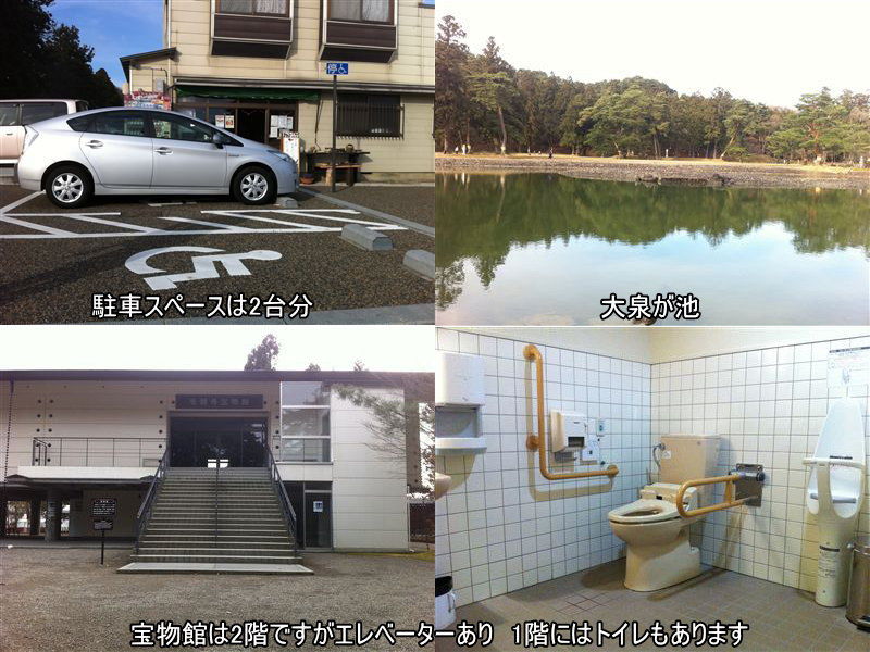 続いての訪問地である毛越寺は、境内の中心に大泉が池を湛え、中尊寺とは異なる平坦な地にある。そのようなことから車いすのアクセスに関して言えば、正門向かいにある駐車場からのアクセスも容易である。境内の宝物館には車いす用トイレが設置されるとともに、エレベーターもあり、館内見学も可能である。