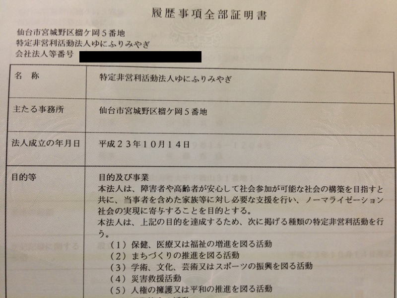 いつもご支援ご協力をいただきありがとうございます。この度、宮城県から法人化の認証が下り、10月14日、法務局へ登記申請をし、特定非営利活動法人となりました。