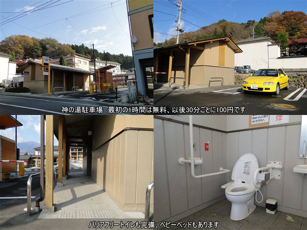 また、この周辺は神の湯と一緒に駐車場も整備され、写真のように車いす対応スペースあり、バリアフリートイレと、安心して温泉街を楽しむことができます