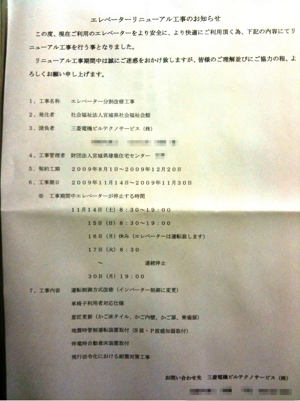 ちょっと不安なところもありましたが、この度、エレベーターのリニューアル工事が行われることになったのです